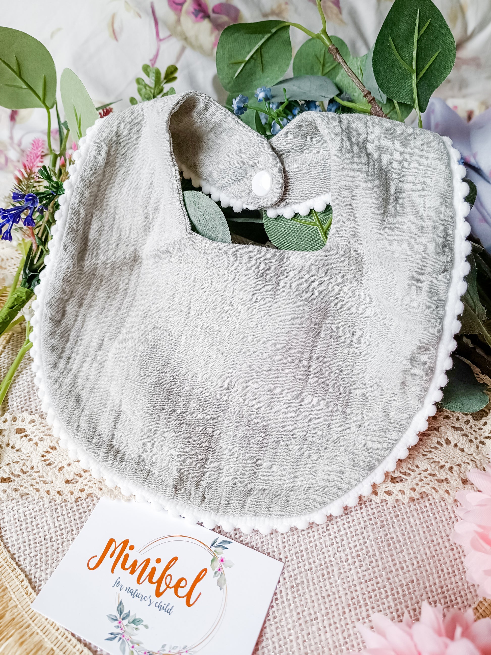- Grey Muslin Bib with Pompom Detail